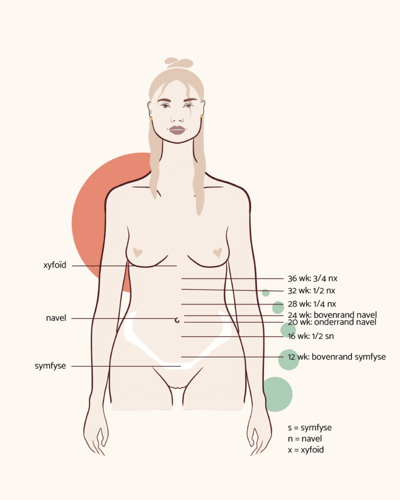 Door met de hand of handen te voelen aan de buik (ook wel palpatie genoemd), kijkt de zorgverlener eerst naar de hoogte van de baarmoeder. Als de zwangerschap nog pril is, zit de baarmoeder verstopt onder het schaambeen. Hoe verder de zwangerschap vordert, hoe groter de baarmoeder wordt en meer richting het borstbeen van de zwangere komt. Dat bedoelen we met de hoogte van de baarmoeder, ook wel de fundushoogte. Het hoogste punt is het deel van de baarmoeder dat het meest bovenaan zit. Vaak is dat in de buurt van het borstbeen, maar als de baby wat scheef ligt, kan het hoogste punt ook meer bovenaan aan de zijkant zitten. Daarna zal de grootte van de baarmoeder worden gemeten. Dit kan op twee manieren: