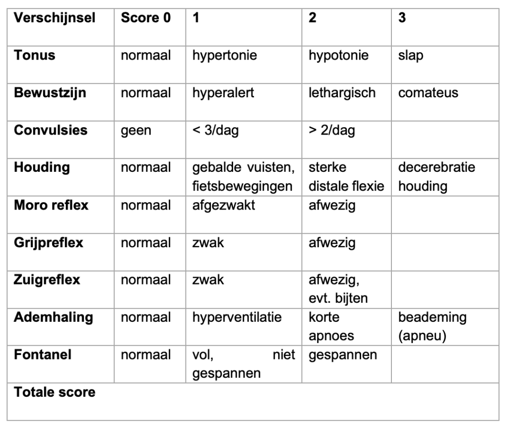 - Encefalopathie gediagnosticeerd door: Thompson score (zie tabel) ≥ 7 op 1 uur na de reanimatie of afwijkend aEEG.